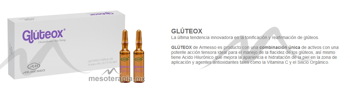 GLÚTEOX de Armesso es producto con una combinación única de activos con una potente acción de aumento y tensora ideal para el manejo de la flacidez de los glúteos, así mismo tiene Acido Hilurónico que mejora el volumen, la apariencia e hidratación de la piel en la zona de aplicación y agentes antioxidantes tales como la Vitamina C y el Silicio Orgánico.