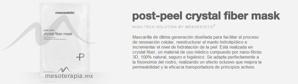 Mascarilla de última generación diseñada para facilitar el proceso de renovación celular, reestructurar el manto hidrolipídico e incrementar el nivel de hidratación de la piel. Está realizada en crystal fiber, un material de uso médico compuesto por nano-fibras 3D, 100% natural, seguro e higiénico. Se adapta perfectamente a la fisionomía del rostro, realizando un efecto oclusivo que mejora la permeabilidad y la eficacia transportadora de principios activos.