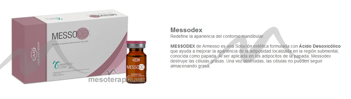 MESSODEX de Armesso es una Solución estética formulada con Ácido Desoxicólico que ayuda a mejorar la apariencia de la adiposidad localizada en la región submental, conocida como papada. Al ser aplicada en los adipocitos de la papada, Messodex destruye las células grasas. Una vez destruidas, las células no pueden seguir almacenando grasa.